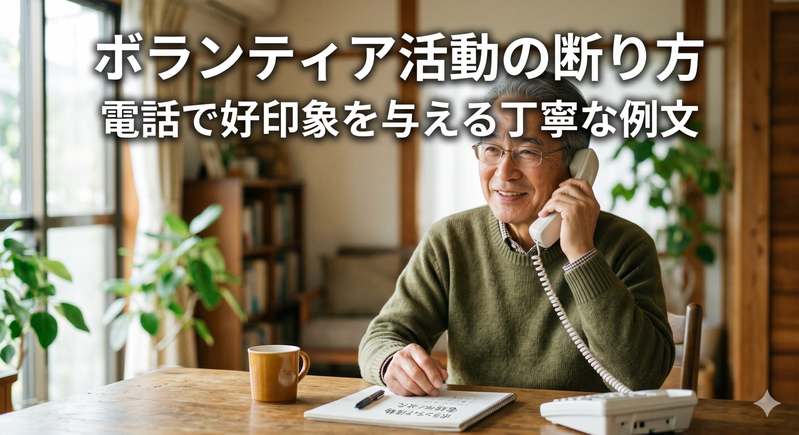 【電話台本】 「お誘いいただき光栄です。お力になりたい気持ちはやま々なのですが、現在は家内のサポート(または孫の預かりなど)に多くの時間を割いており、決まった時間に活動に参加することが難しい状況です。